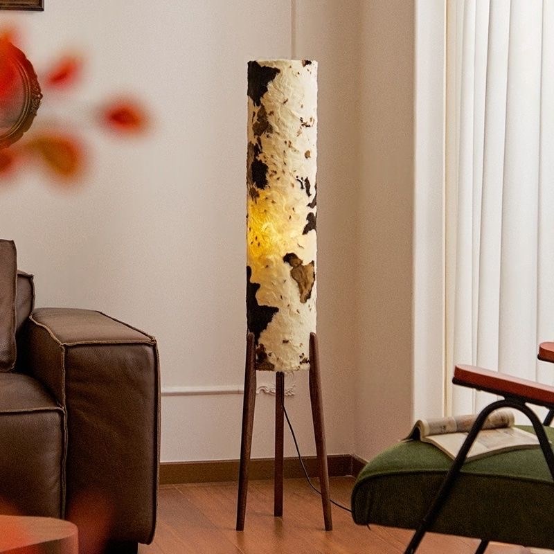 Высокий цилиндрический абажур, установленный на тонкую деревянную треногу.